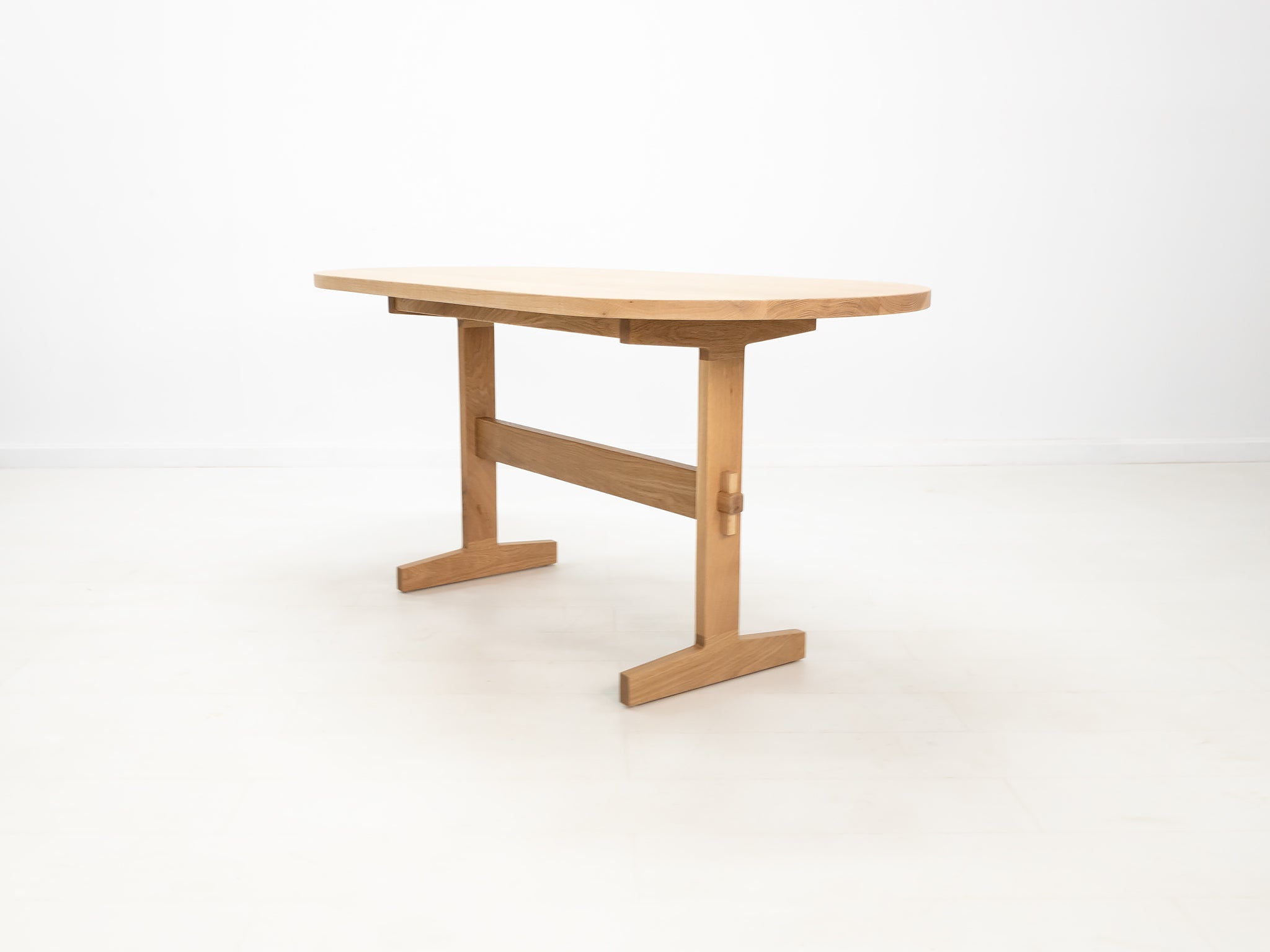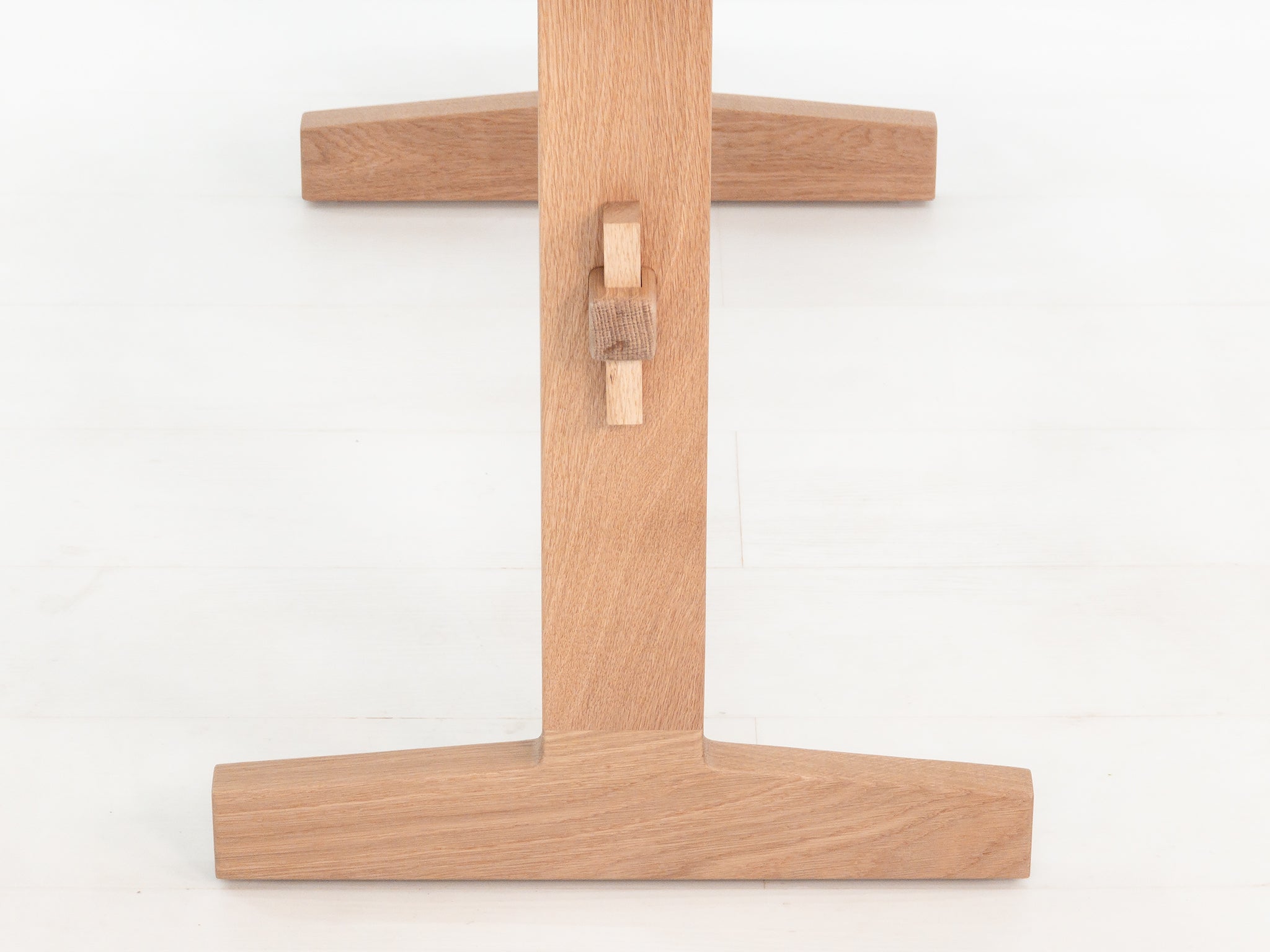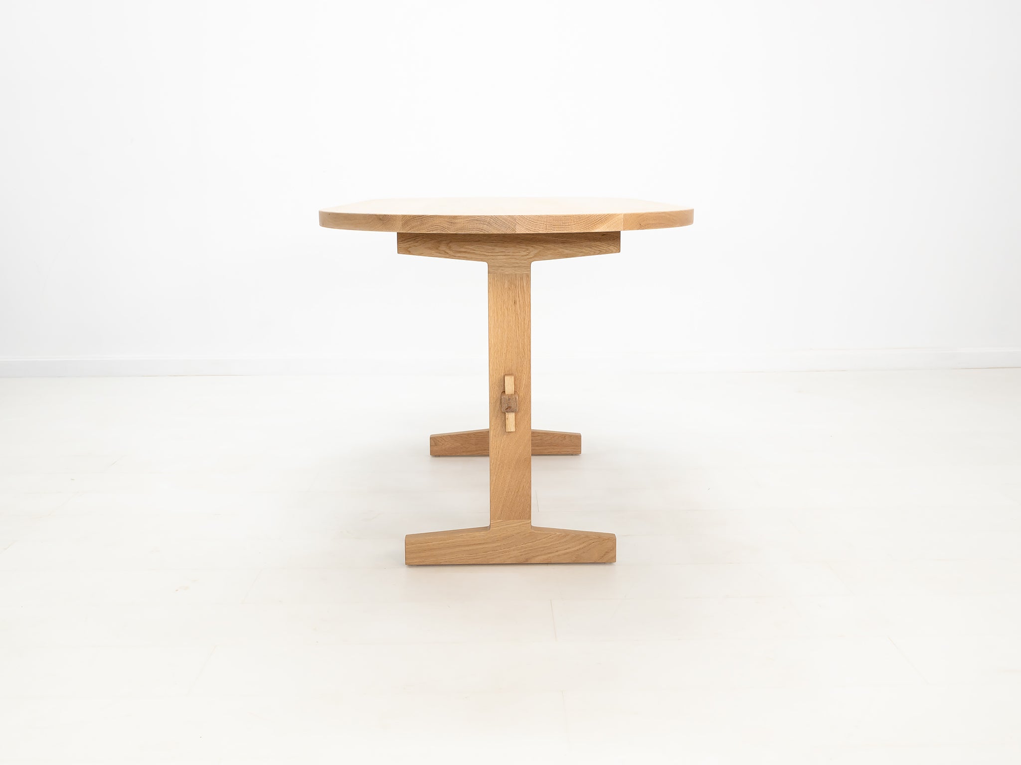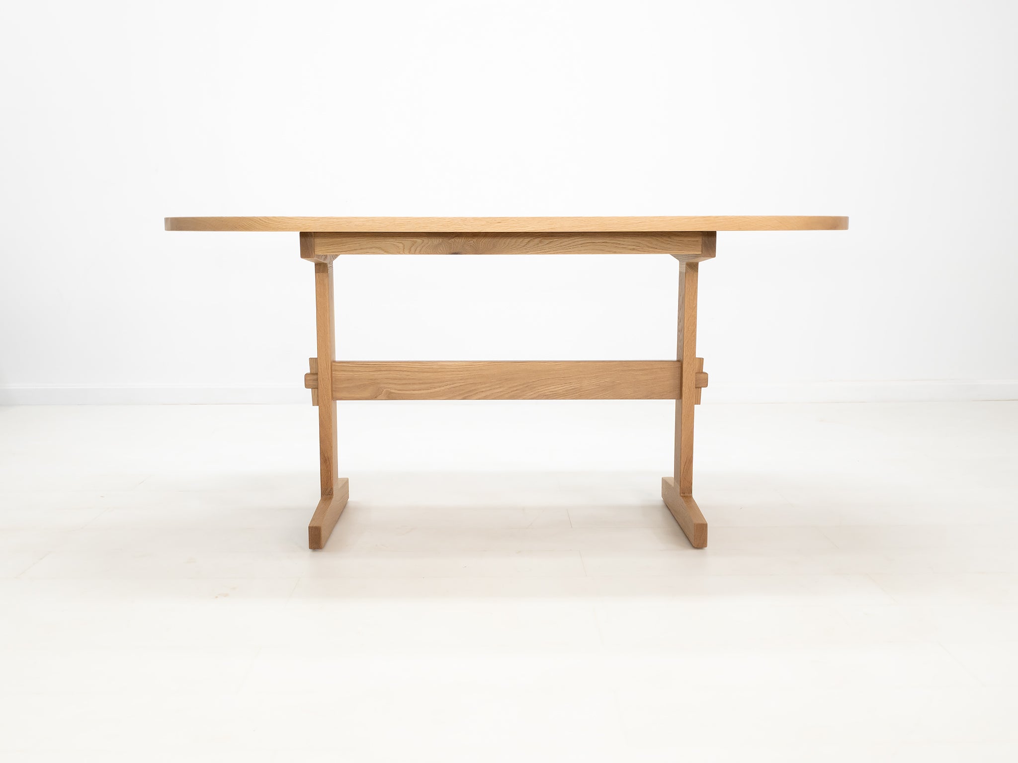 The BANQ dining table is designed with banquette seating and kitchen nooks in mind—bringing together comfort, function, and clean design. Built from solid American hardwood, it features a trestle-style base with wide-set legs for stability. Smaller sizes include two legs; larger sizes add a centered third leg for support without crowding the seating area.