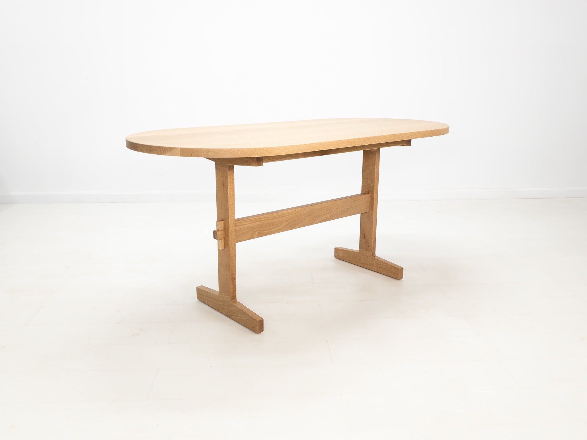The oval top is approximately 1⅜ inches thick, with a smooth surface and soft curves that make it easy to gather around. Each table is crafted from FAS-grade kiln-dried lumber with minimal knots for strength and consistent grain.