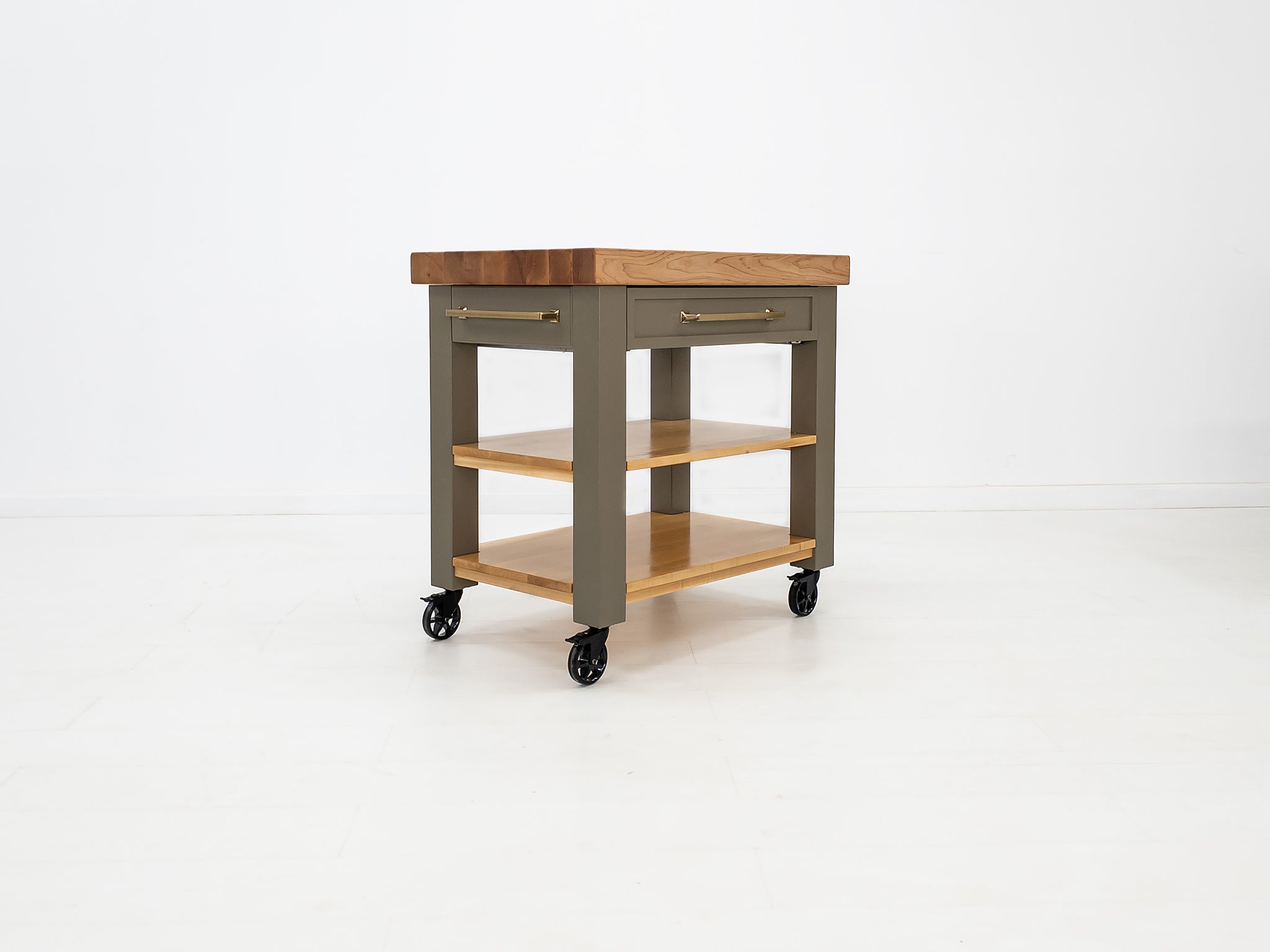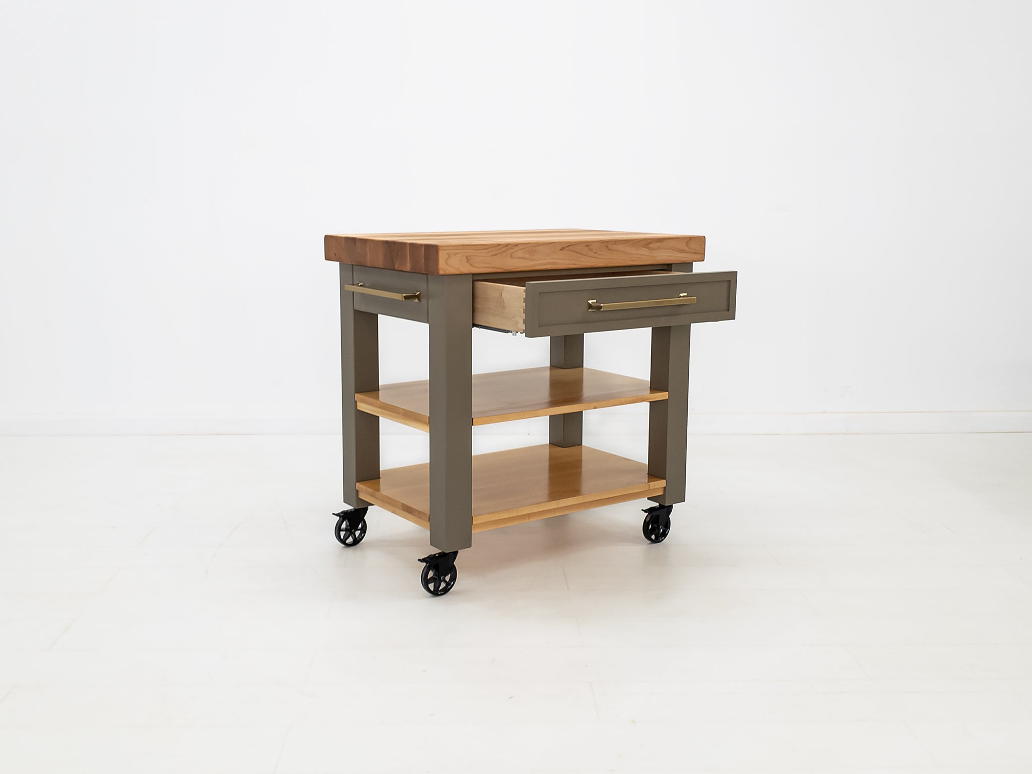The CHEF butcher block kitchen island or cart is handcrafted to order from locally sourced New England sugar maple—known for its durability, tight grain, and naturally sanitary properties. The butcher block top is conditioned with a blend of beeswax and food-safe mineral oil, while the solid maple shelves are treated with a natural hardening oil. Each piece includes a container of our in-house butcher block wax to help preserve and protect your island for years to come.