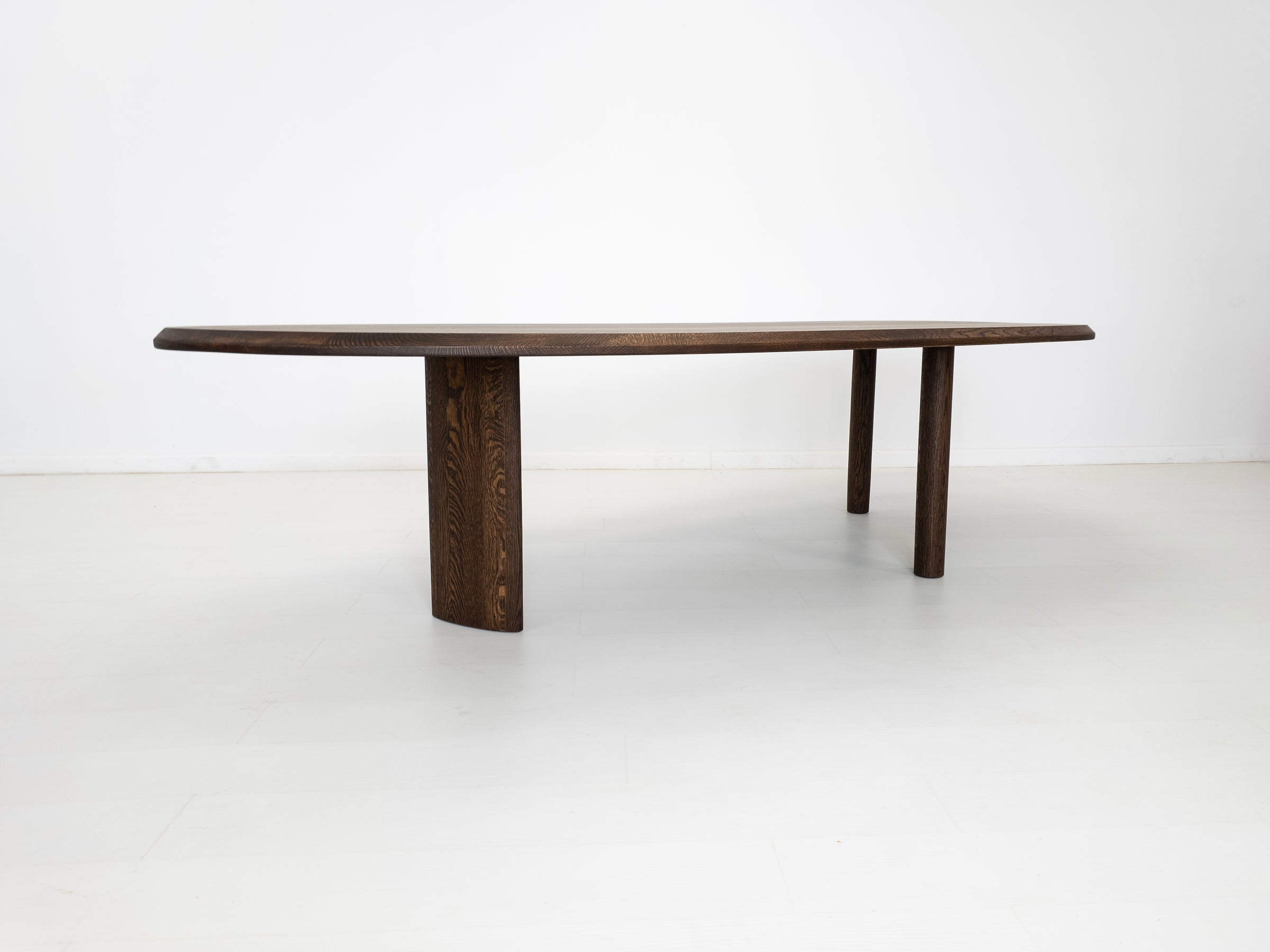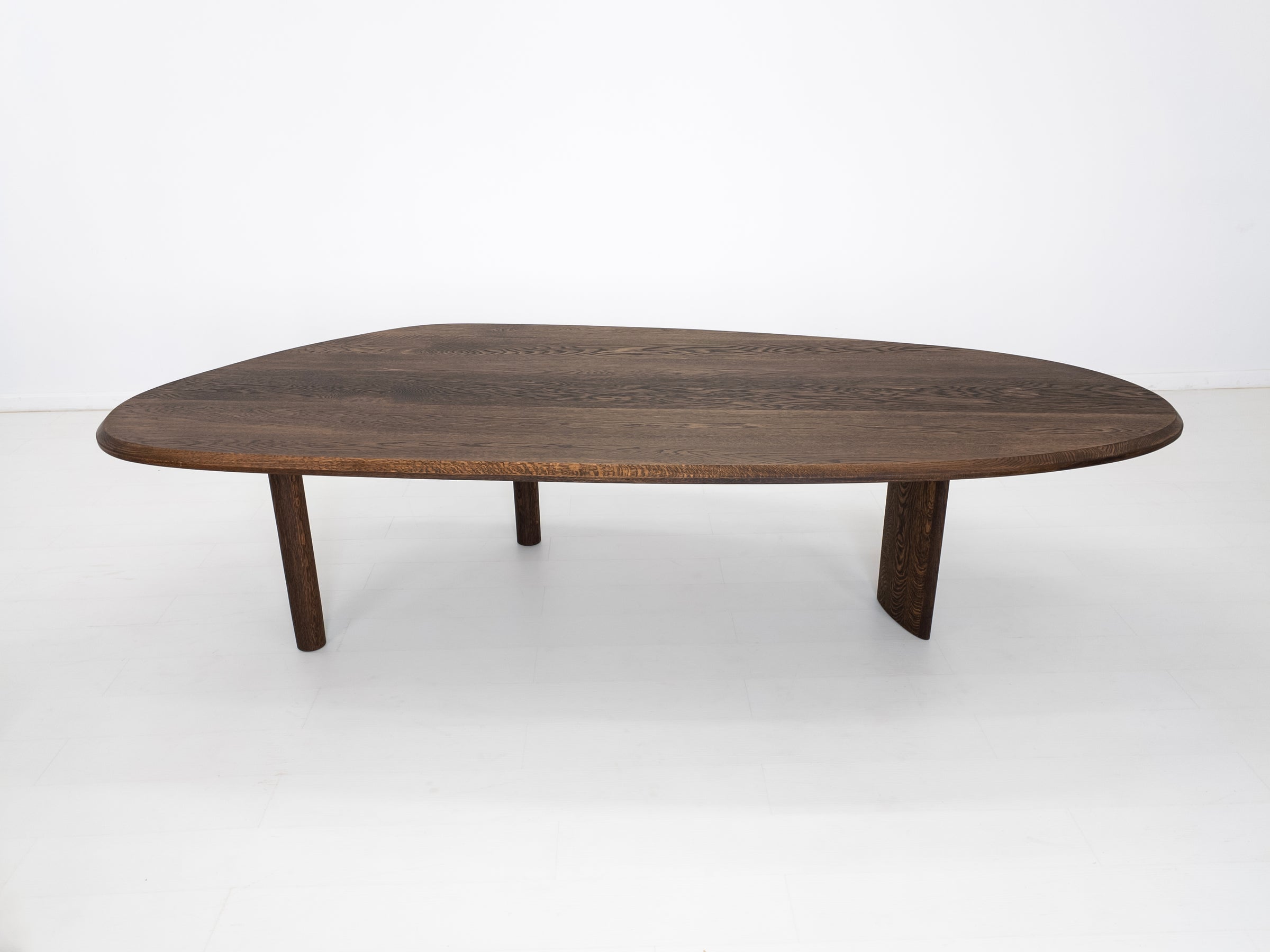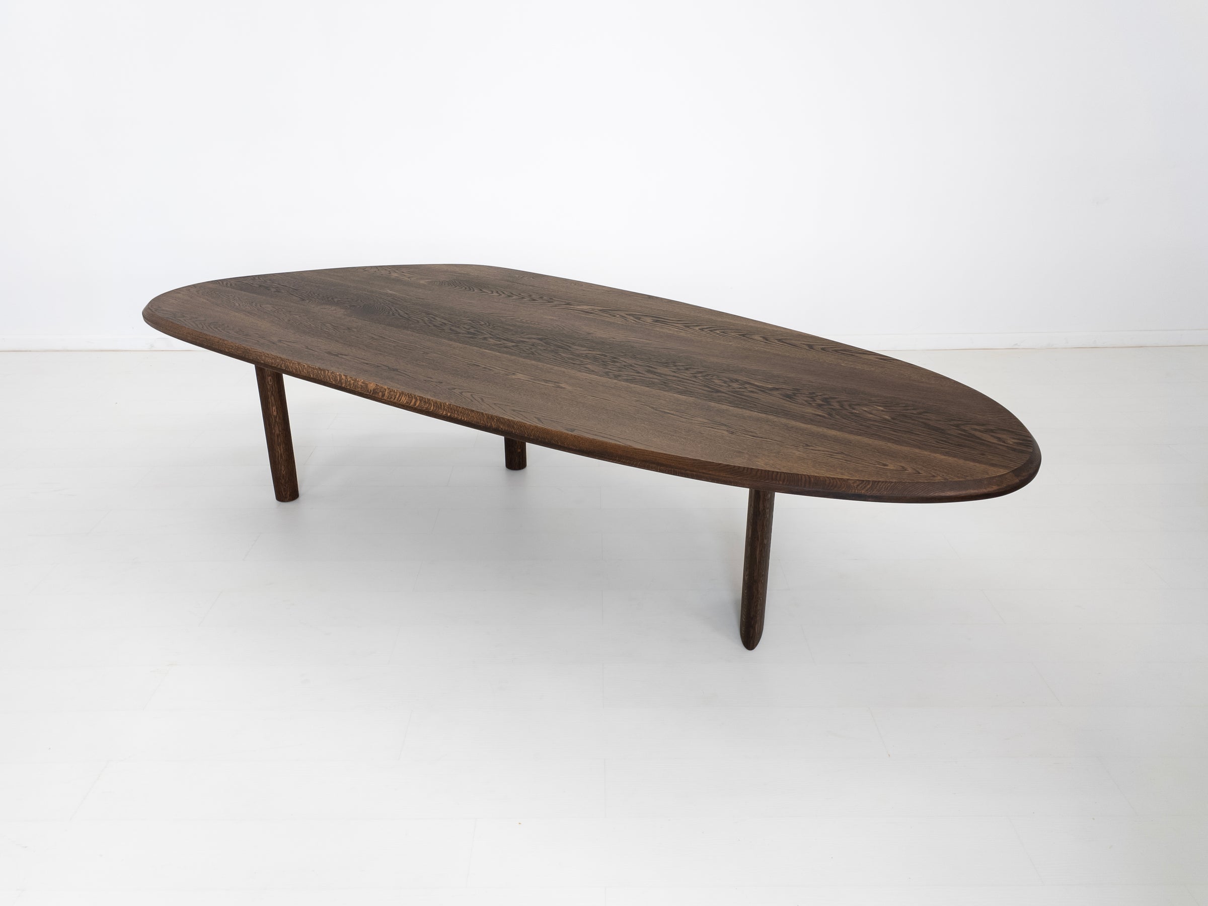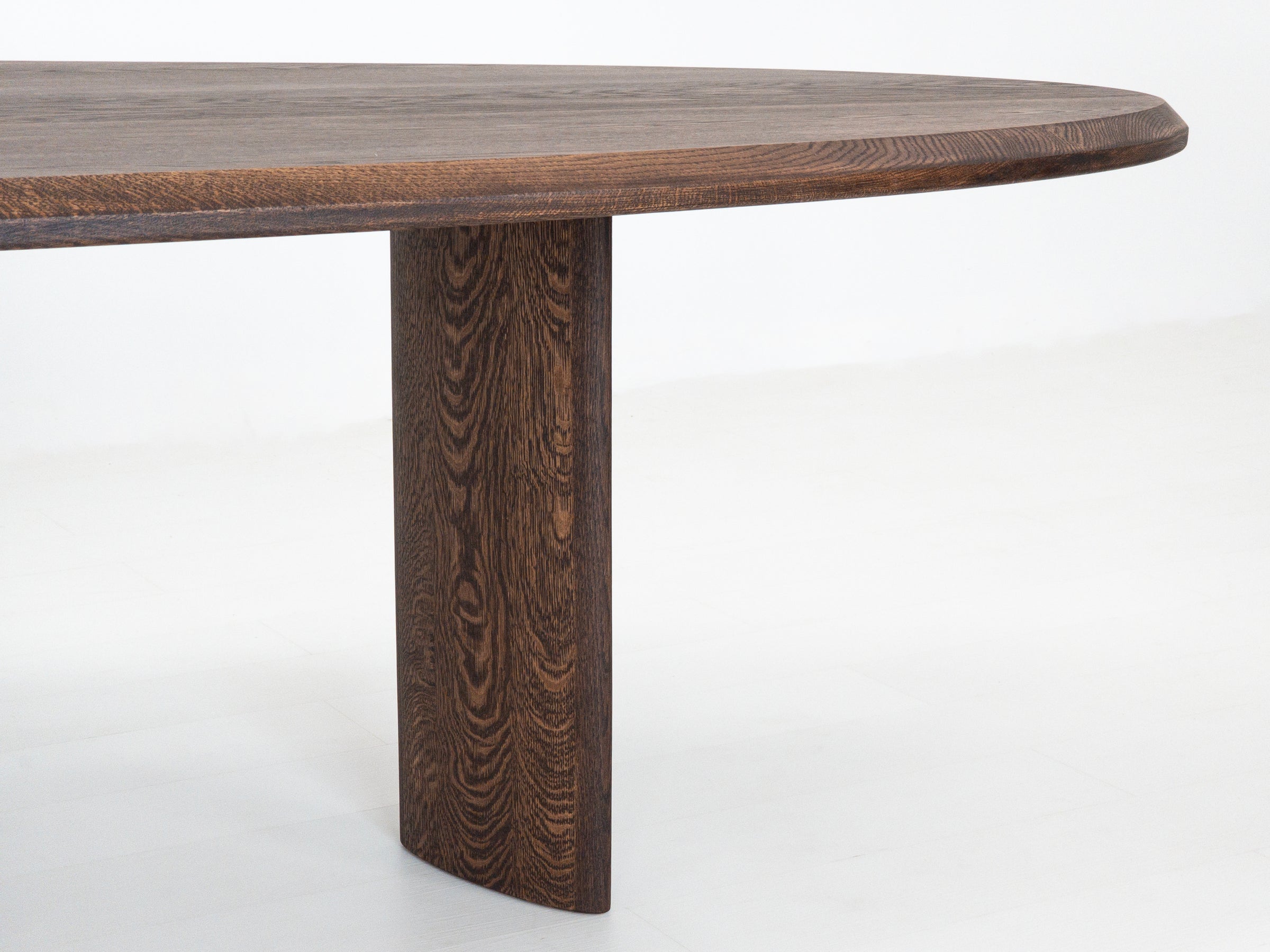 Its wide, curved legs echo the lines of the tabletop, grounding the design while offering sturdy, functional support. A hand-applied hardwax oil finish warms the tone of the oak and highlights its grain, providing everyday durability with a natural look.